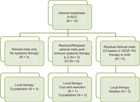 Three patients presented with adrenal metastases only, and were treated with local therapy and achieved complete remission. Three received high-dose IL-2. One patient received high-dose IL-2 for bone metastases and relapsed with a solitary adrenal metastasis 11 years later, which was treated with cryotherapy. The same patient developed metastasis in the other adrenal 18 months later, which was treated with surgical resection. He was rendered into complete remission after surgical resection and continued with no evidence of disease 1 year later. Of the other two patients receiving IL-2 therapy, one had unresectable large adrenal masses and is now demonstrating response to antivascular therapy. The other patient progressed on IL-2 but demonstrated a response to ipilimumab and nivolumab at all sites except in the adrenal gland. The adrenal lesion was treated with cryoablation. Five cases received immune checkpoint inhibitor (ICI) and one received antivascular therapy. ICI-based regimens were ipilimumab + nivolumab in two patients, and axitinib and pembrolizumab, a combination of avelumab and an adenosine receptor inhibitor and bevacizumab and atezolizumab, each in one patient. ICI therapy was followed by ablation of residual adrenal metastases in three patients. All patients with residual adrenal metastases post-immune therapy responded to antivascular therapies or to local ablation. With a median follow-up of 9.5 years (range: 4 years to 26 years), one patient had expired 17 years after diagnosis. Eleven patients are alive and follow-up is ongoing. The systemic and local therapy management is summarized in Figure 3.