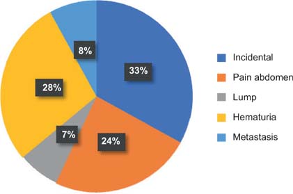 In our study, most of the patients were symptomatic (67%) with most common presenting symptom being haematuria (28%) followed by pain abdomen (24%), and incidentally diagnosed RCC accounting for only 33%. This is in contrast to findings in Western studies where more than 60% of renal cancers are diagnosed incidentally (20). The incidence of incidental RCC is still higher in our data compared with other Indian studies (4). Similar findings have been noted in another Indian study (21). This could be due to the changing trend towards earlier detection of RCC in India.