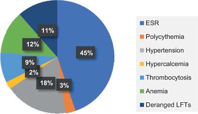 It has been established in literature that approximately 20% of patients with RCC develop PNSs (22, 23). These data have predominantly been derived from Western population. In our study, 56.3% patients developed PNS, with raised ESR being the most common (62.5%), followed by hypertension (25%), anaemia (17%), deranged LFTs (16%), thrombocytosis (12%), polycythaemia (4%) and hypercalcaemia (3%). The postulated mechanisms for PNS in RCCs are elevated cytokines (especially IL-6), tumour secreting hepatotoxins and lysozymes (hepatic dysfunction/Stauffer syndrome), renin and IL-6 secretion by tumour cells (hypertension), erythropoietin secretion by tumour cells (polycythaemia), thrombopoietin secretion by tumour cells (thrombocytosis), chronic disease, poor nutritional status and increased iron-binding protein Lactoferrin (anaemia) (21). Immunohistochemistry (IHC) is not routinely applied to the tumour slides for demonstration of tumour cell production of the paraneoplastic agent. Interestingly, hypercalcaemia, which has been noted to be a common PNS in RCC, was found to be the least common in our study (15, 24). This study is the first that highlights the incidence of PNS in the Indian population, and the figure is significantly higher. The reason for the high incidence of PNS could be higher stage of presentation in Indian population, or it could be due to genetic or environmental factors, which need to be further studied.