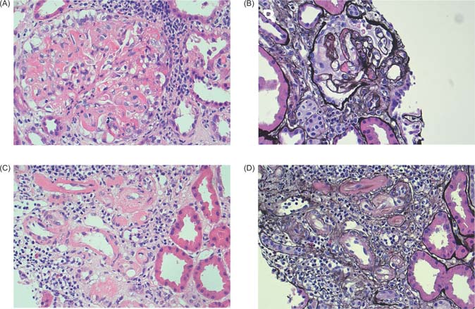 Figure 1: Light micrographs of kidney transplant biopsy. (A) Glomerulus with intracapillary fibrin, red cell fragments, and karryorhectic debris (hematoxylin and eosin × 40). (B) Segmentally sclerosed glomerulus with double contouring and fibrin (silver × 40). (C and D) Arterioles with fibrin, and focal onion skinning with myxoid intima, red cell fragments, and karyorrhexis (C: hematoxylin and eosin × 40; D: silver × 40).