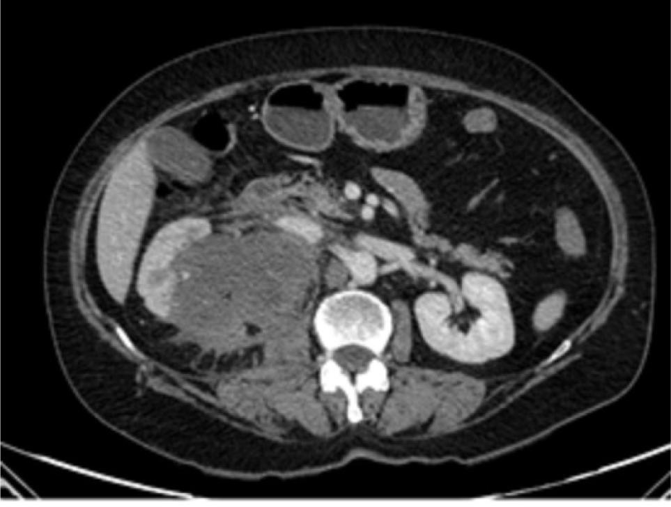 Figure 1: CT scan of the abdomen demonstrates the right renal mass.