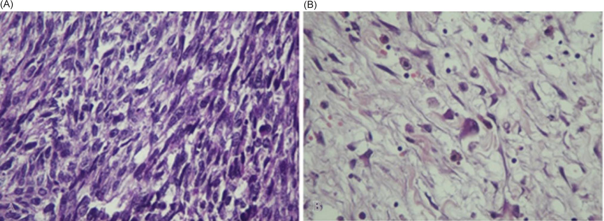 Figure 2: (A) H&E section from tumor show malignant spindle cells with hyperchromatic nuclei. (B) H&E section show some atypical spindle and round cells with abundant eosinophilic cytoplasm (Rhabdomyolysis differentiation).