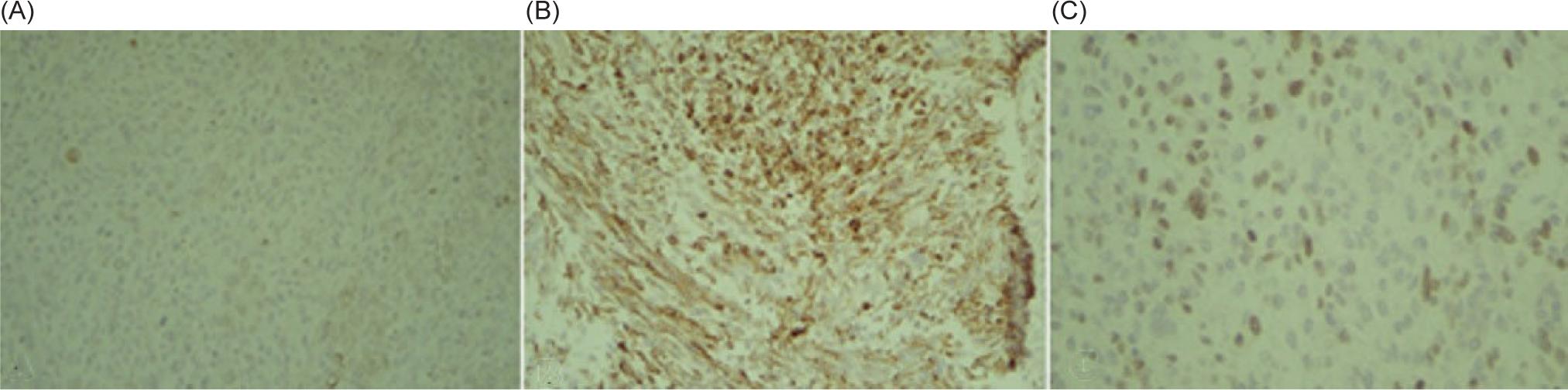 Figure 3: Immunohistochemistry positive reaction for (A) Creatine kinase. (B) Desmin. (C) Myogenin.