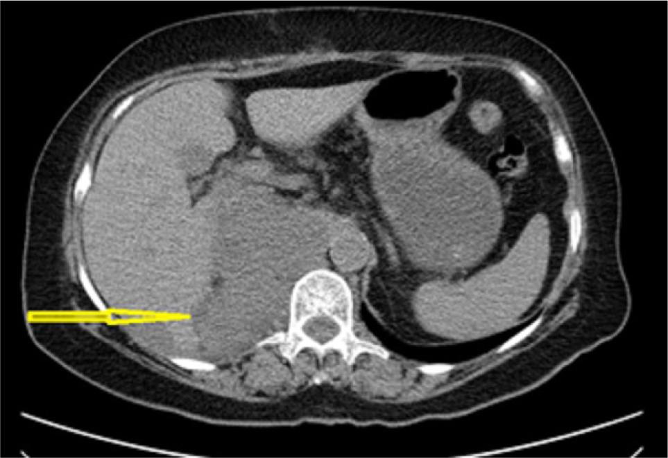 Physical examination revealed only mild right flank tenderness with right palpable, nonmobile mass. Urine analysis showed microscopic hematuria (15/20 RBCs/HPF). The routine blood tests were within the normal range. Ultrasonography (US) showed a 20×25 cm solid hypoechoic mass in the right med and lower pole of the kidney. A chest, abdomen, and pelvic computed tomography (CT) scan was done, which showed a 20×25×8 cm heterogeneous solid mass in the middle pole that extended to the lower pole of the right kidney with delayed enhancement . There was no evident local invasion or metastases in the chest CT scan. However, the tumor was pressing the liver, and no defined fat planes were seen (Figure 1).