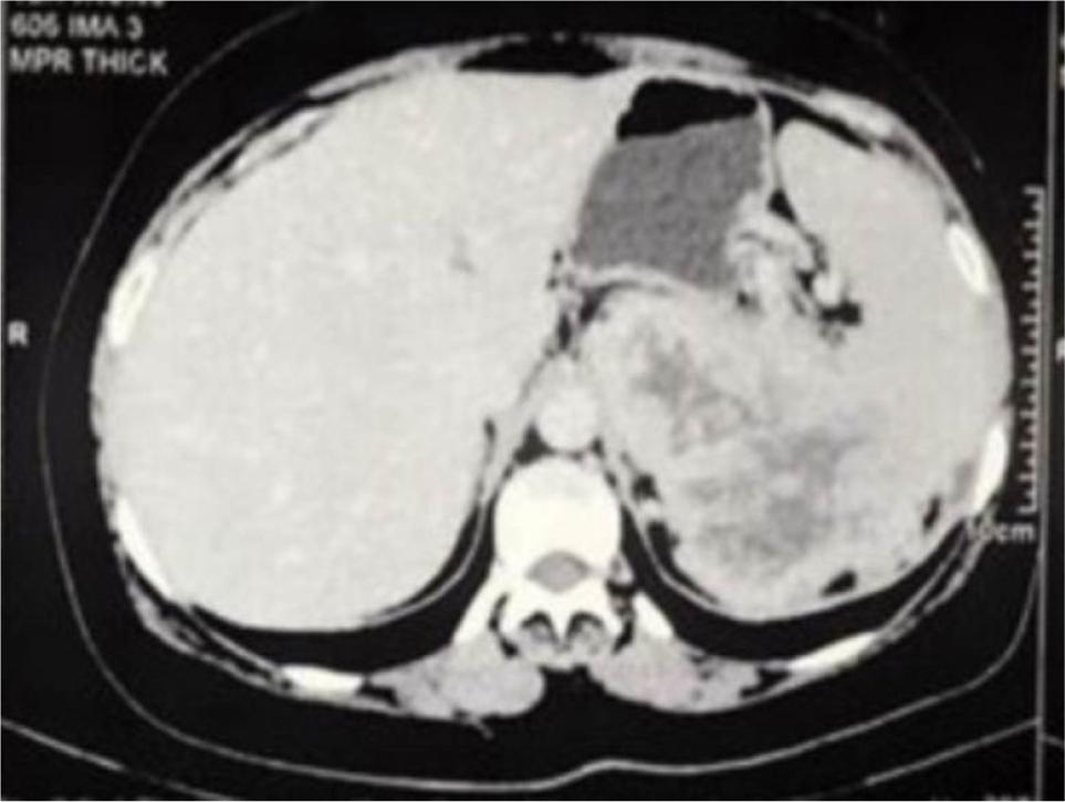 Figure 1: Axial CT abdomen showing large left renal mass infiltrating the spleen and pancreas.