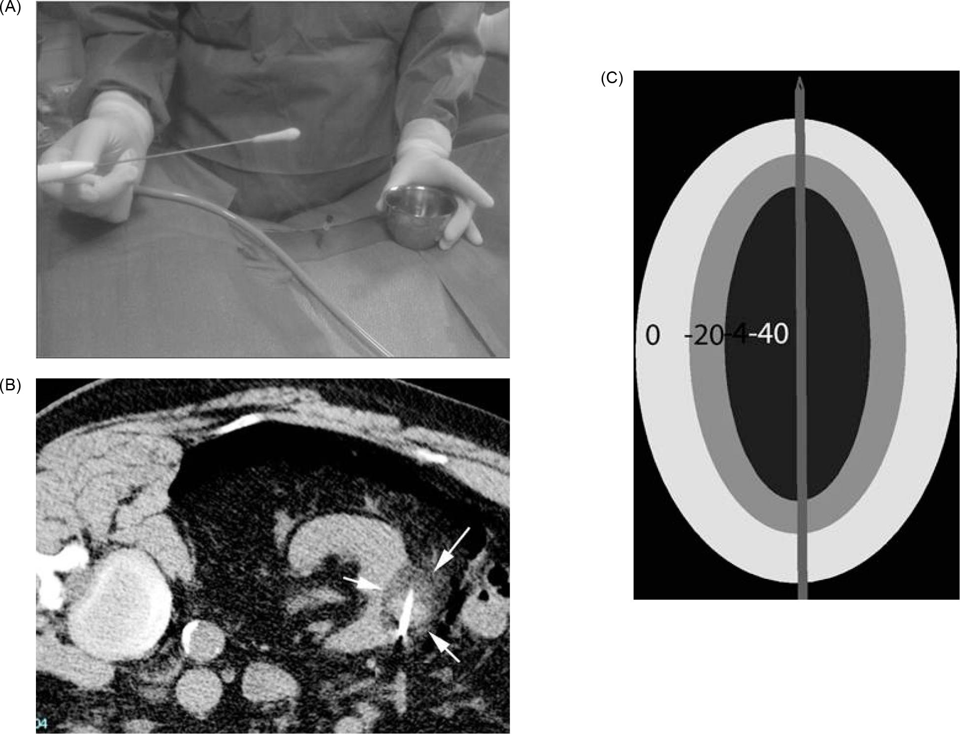 Figure 3: (A) Multi-tined radiofrequency ablation antenna. (B) Radiofrequency ablation antenna expanded within tumor. (C) Typical tissue changes after successful radiofrequency ablation including pseudo-capsule, subcapsular fat, and nonenhancing lesion.