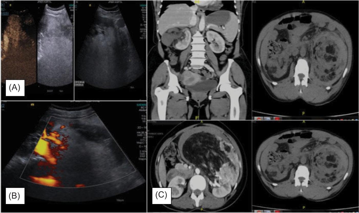 Figure 1: (A) Ultrasonographic images of renal angiomyolipoma; (B) Doppler images showing perirenal haemorrhage, that is, Wunderlich syndrome; (C) Contrast-enhanced computed tomography showing renal angiomyolipoma with Wunderlich Syndrome.