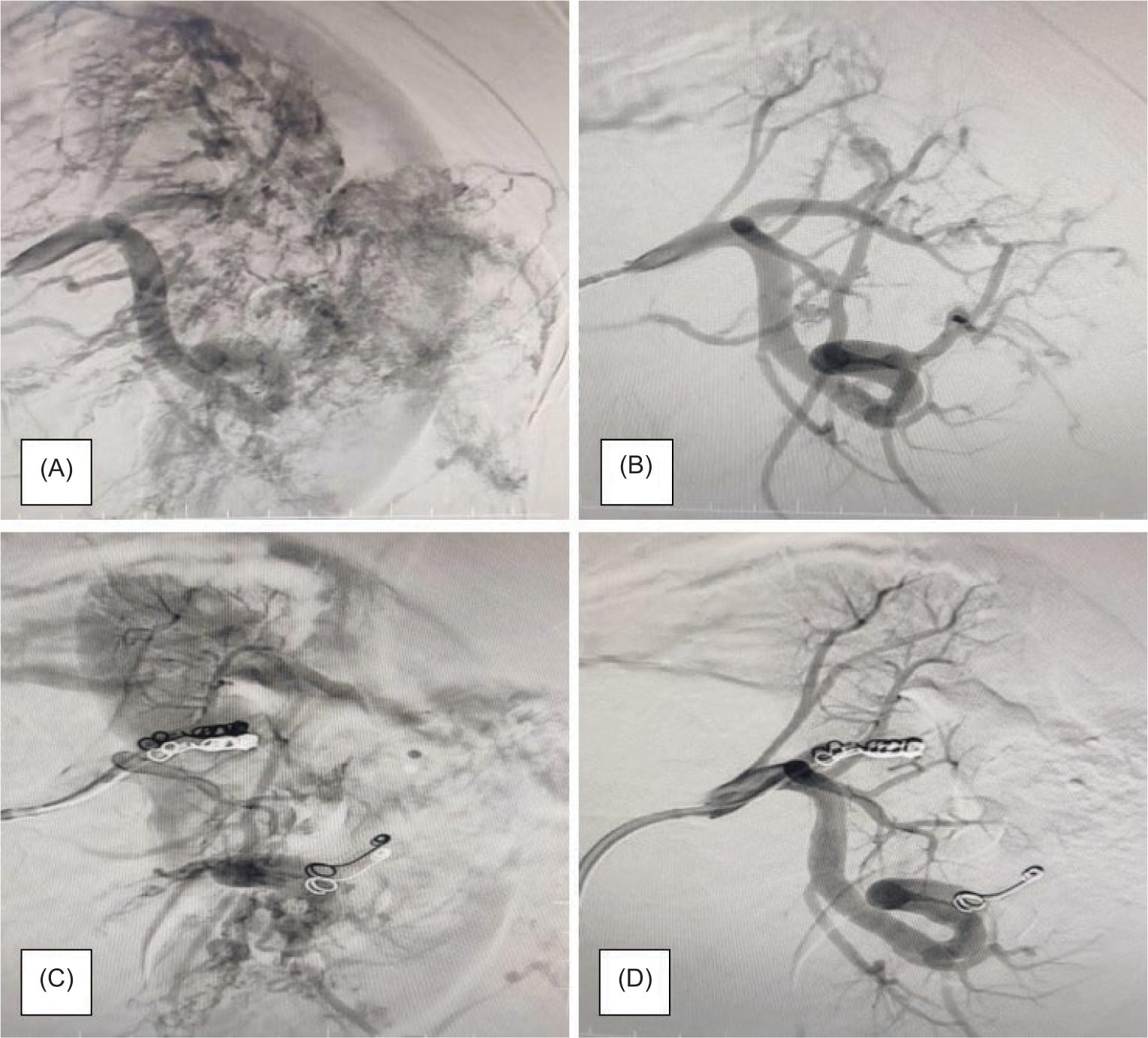 Figure 2: (A & B) Angiography showing the renal vasculature in a patient with renal angiomyolipoma; (C & D) Selective angioembolization showing the coils in place.