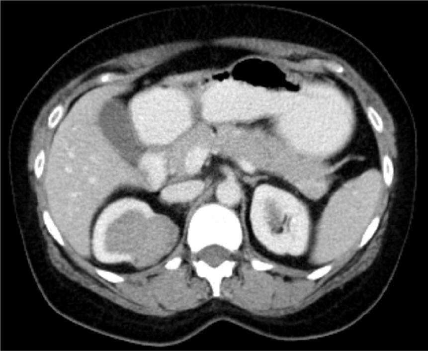 Figure 1: Contrast-enhanced CT scan of the abdomen showing renal mass in the right kidney.