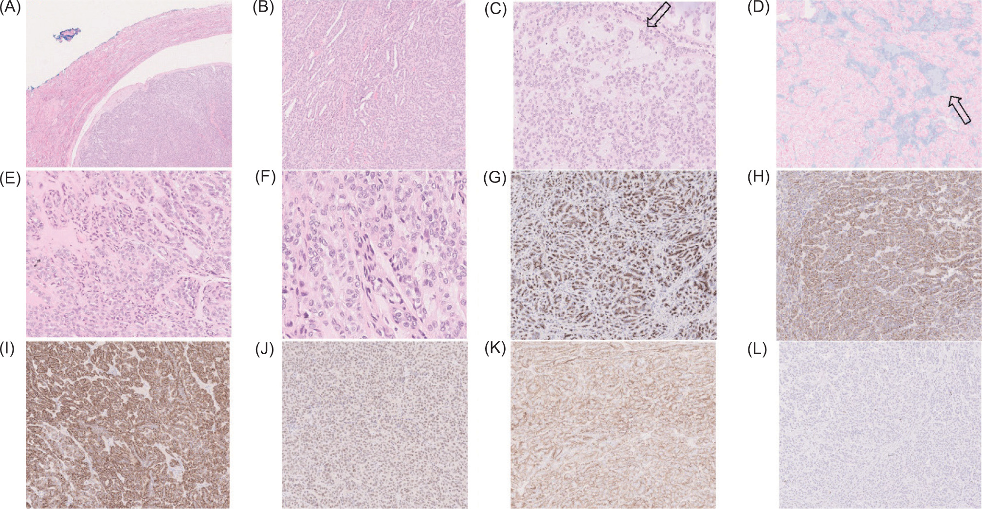 The gross examination of specimen revealed a pinkish nodule measuring 2.2 × 2 × 1.5 cm and weighing 3.8 g. No necrosis was noted. Microscopically, the tumor was covered by a thin fibrous capsule partly surrounded by a thin rim of renal tissue (Figure 2A). The tumor consisted of closely packed tubules with scattered long tubular structures (Figure 2B). There was myxoid stroma and the extracellular mucin areas were highlighted by Alcian Blue staining (Figure 2C and 2D). The cuboidal tumor cells had moderate amount of pale to light eosinophilic cytoplasm with transition to spindle cells (Figure 2E and 2F). Mitotic activity was inconspicuous, and necrosis was not found. Immunohistochemically, it showed positivity for EMA (epithelial membrane antigen) (Figure 2G), AMACR (alpha-methylacyl-CoA racemase) (Figure 2H), CK7 (cytokeratin 7) (Figure 2I), PAX8 (Figure 2J), and CD56 (Figure 2K). MIB-1 proliferation index showed a rate of less than 1% (Figure 2L). The diagnosis of MTSCC was confirmed. The TNM (tumor, node, metastasis) stage was pT1a; no adjuvant treatment was given; and a surveillance scan was arranged.