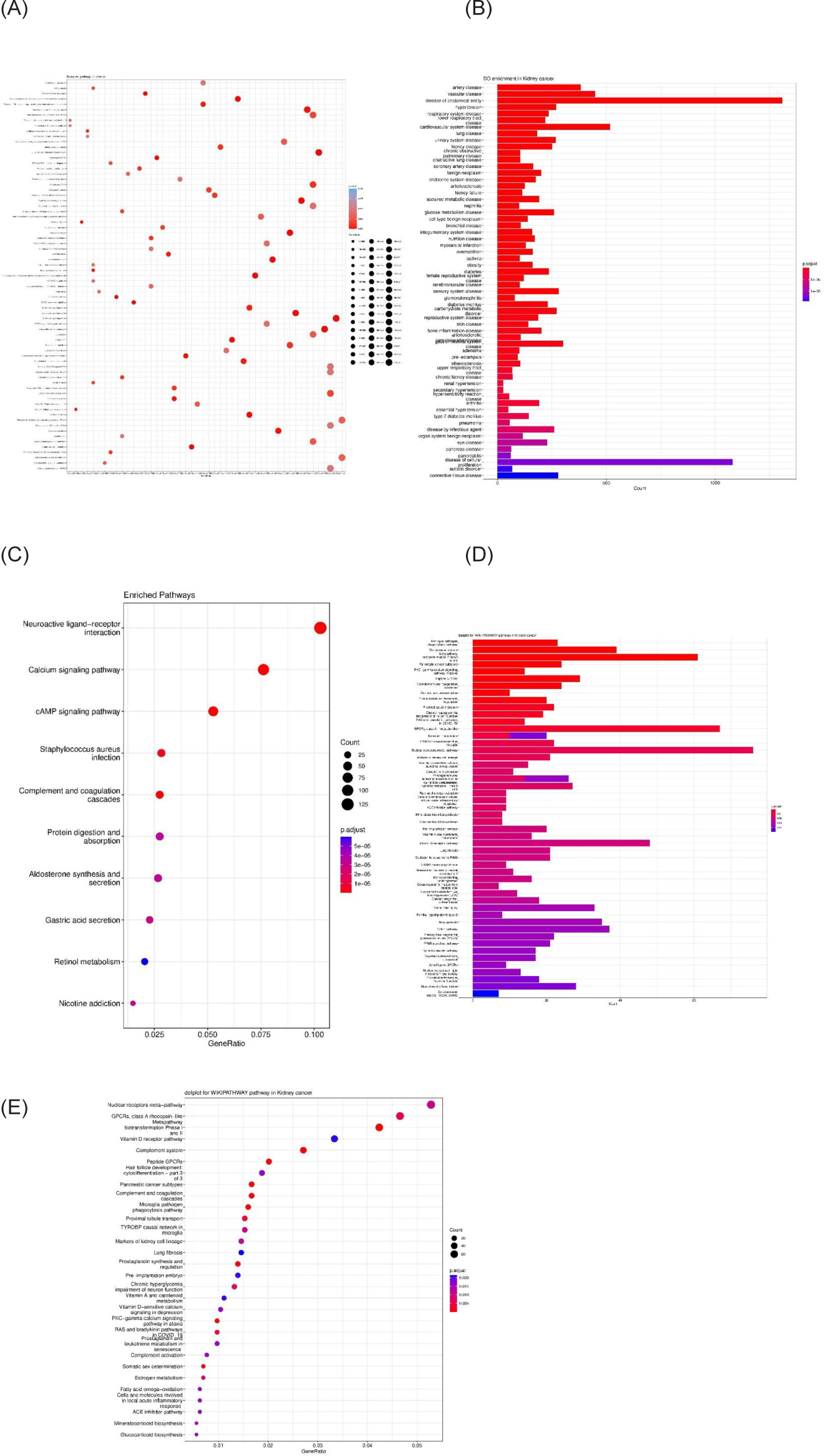 Figure 3: (A) Reactome pathway enrichment, (B) DO enrichment in kidney cancer, (C) Enriched pathways, (D) Barplot for WIKIPATHWAY pathway in kidney cancer, (E) Dotplot for WIKIPATHWAY pathway in kidney cancer. The P-value is less than 0.05 and is shown by the color.