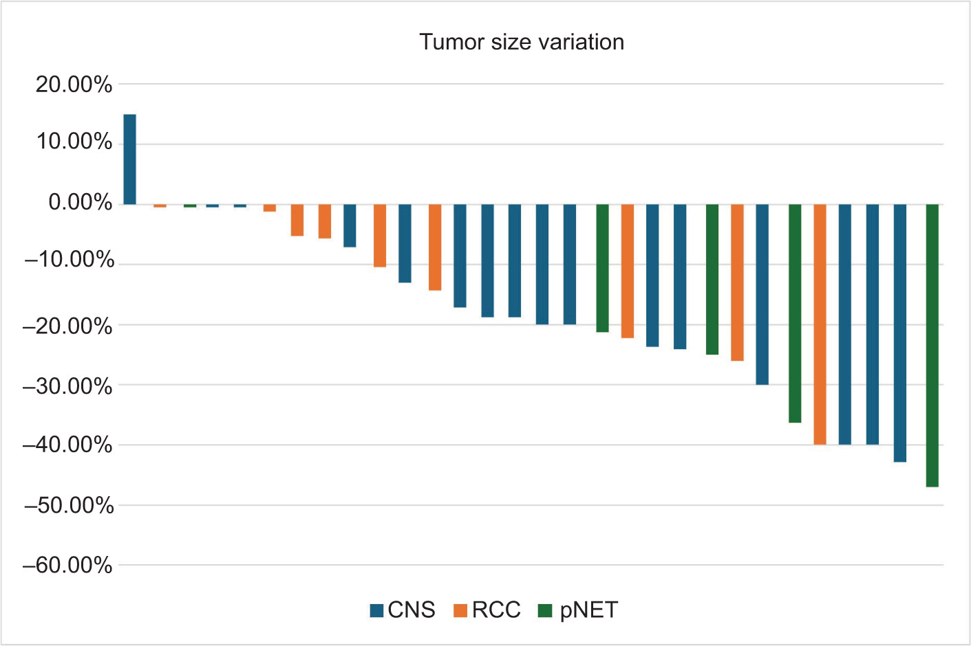 Figure 1: Waterfall plot showing tumor size variation at the best radiological response.