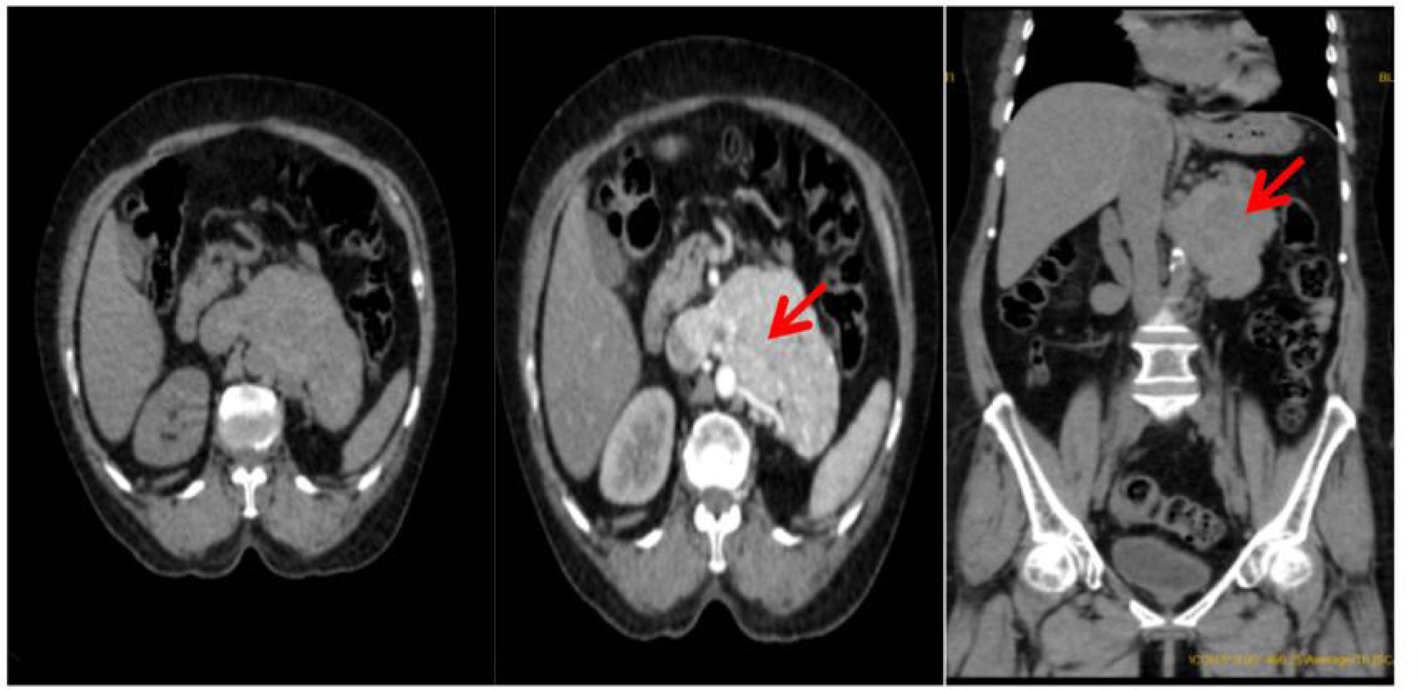A contrast-enhanced CT urogram was then performed, which revealed a heterogeneously enhancing left retroperitoneal mass with necrotic areas. The mass had extended into the periaortic region and involved the IVC, suggestive of recurrent RCC with possible vascular invasion (Figure 2).