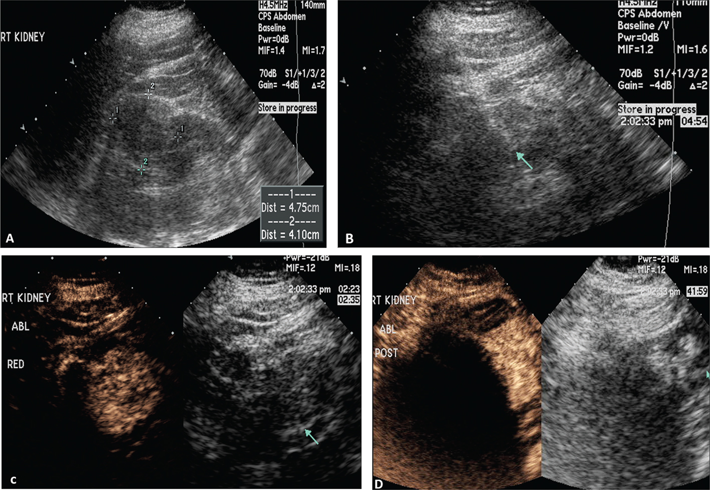 Figure 1. Images demonstrating RFA of an RCC. (A) B-mode image of the RCC (calipers) pre-procedure, (B) B-mode image demonstrating positioning of the RFA needle (arrow) in the RCC, (C) image after injection of ultrasound contrast confirming the needle (arrow on low MI B-mode image on right) within the tumor, and (D) CEUS post-procedure demonstrating complete ablation of the RCC (arrow, right).