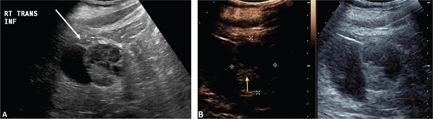 Figure 3. Successful ablation. Patient presented for 3-month post-RFA evaluation. (A) B-mode image before the ablation. Large heterogeneous tumor is noted on gray scale examination (arrow). (B) Absence of residual blood flow (arrow) is demonstrated on CEUS examination.