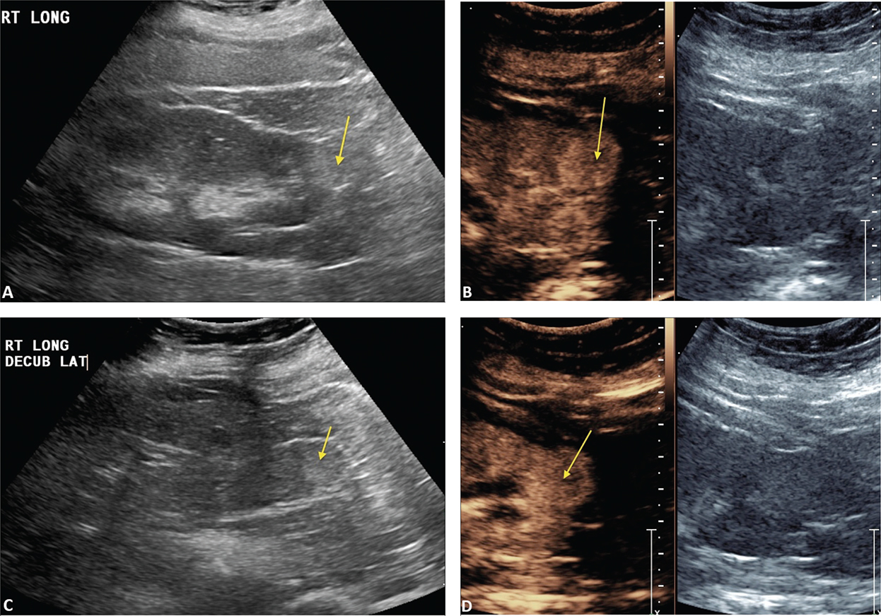 Figure 5. Failed ablation. Patient has history of prior left nephrectomy for RCC and presented with right renal mass. (A) Gray scale image of mass (arrow) pre-ablation. (B) CEUS demonstrating increased flow in tumor (arrow) at inferior pole of right kidney. (C) Gray scale image post-RFA of the mass (arrow). (D) CEUS post-RFA demonstrating flow throughout the tumor (arrow), indicating failed RFA.
