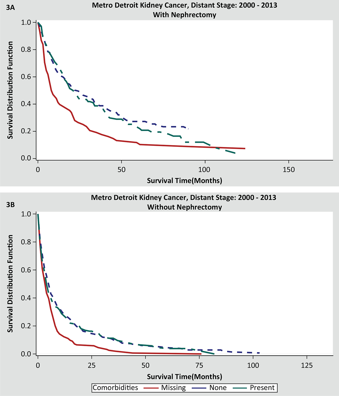 The data regarding comorbid conditions were only available for the Metro Detroit (MDCSS) Registry. While not collected as a population-based variable, comorbidity status was coded for 82% of regional and 76% of metastatic kidney cancers seen in Metropolitan Detroit. Nephrectomy was performed in 92% of regional stage and 34% of distant stage patients; our analysis pertains to only the distant-stage patients. Dichotomous comorbidities (yes or no for: hypertension, cardiac disease, diabetes mellitus, kidney disease, and lung disease) and number of comorbid conditions (none, 1, 2, 3+, and missing) are included in the patient characteristics of MDSCC (Table 4). The demographic and tumor characteristics were concordant with the all SEER data; 44.9% of the patients had none of the comorbidities. Adjusted demographic predictors of increased likelihood of receiving nephrectomy for Metropolitan Detroit patients were age < 64 years, non-black race, and married status. Non-clear cell histology (OR = 2.16, 95% CI: 1.42–3.28) and undifferentiated or high also predicted a higher likelihood of CN. Adding comorbidities and number of comorbidities to the model did not impact the likelihood of receiving nephrectomy. All comorbidity types and numbers were not statistically significant in terms of predicting the likelihood of CN and OS (Table 5). Patients with hypertension (OR = 1.75, 95% CI: 0.63–4.87) or diabetes mellitus had greater likelihood of receiving nephrectomy (OR = 1.16, 95% CI: 0.42, 3.21). The group of patients with missing comorbidity data (261/1104, 23.6%) had a significantly shorter OS in both CN and non-CN categories. The actual correlation of comorbidities with likelihood of CN remains elusive due to the group with missing data constituting 24% of the population; 26% of this group had a nephrectomy and demonstrated a median OS of 8 months as compared to the 76% with a median OS of 2 months (Tables 4 and 5; Figure 3A and 3B).