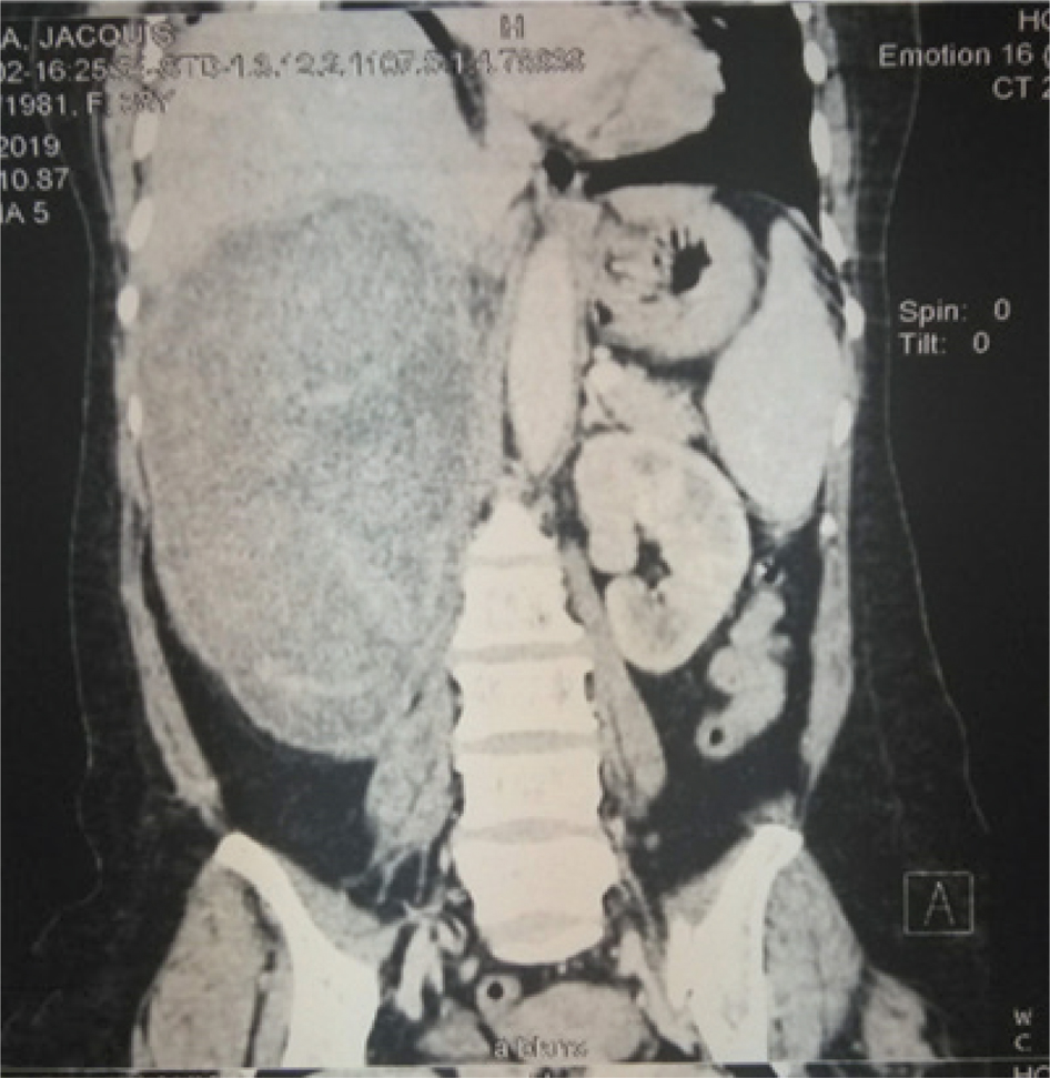 Figure 1: A contrast coronal CT-scan showing a hyper vascularized right T4 renal tumor found to have affected the renal vein, IVC, and inferior margin of the liver.