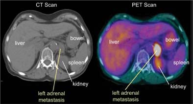 Figure 1: Computed tomography and positron emission tomography imaging showing adrenal gland metastasis.