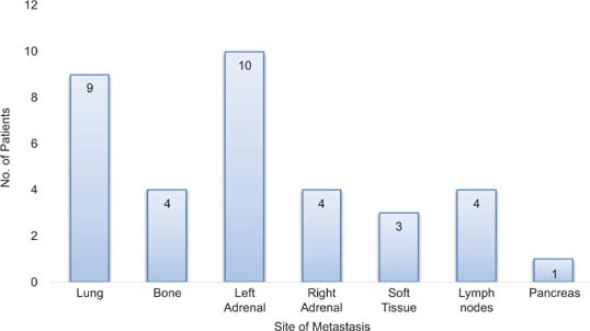 Twelve patients were included in this retrospective report. Eleven had clear cell histology, but one had translocation-type histology. Patient characteristics are summarized in Table 1. The median time from RCC diagnosis to adrenal metastasis was 68 months (range 0–252 months), and the median time from initial metastatic disease to appearance of adrenal metastasis was 15 months (range 0–111 months). A typical scan showing adrenal metastases is depicted in Figure 1. The sites of metastases are summarized in Figure 2. Four patients had bilateral adrenal metastases.