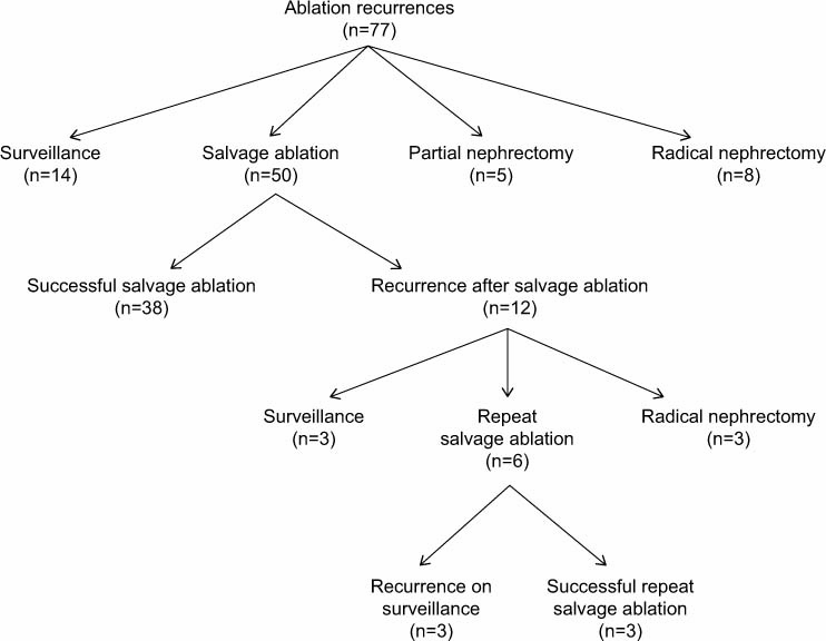 Figure 1 highlights the management strategies employed in those experiencing disease persistence or recurrence following RFA or CA. Of the 77 patients, 14 chose surveillance, 50 underwent secondary salvage ablation, and a total of 13 underwent extirpative surgery (five partial, eight radical). The patient experiencing metastasis had an 8.4-cm clearcell carcinoma in a solitary kidney with medical comorbidities. This patient developed pulmonary metastasis 7 months post-procedure managed by surveillance due to competing medical issues. In the cohort that proceeded with salvage ablation, a successful salvage procedure was documented in 38 patients, whereas 12 patients experienced recurrence after salvage ablation. In these 12 patients with a second postsalvage ablation recurrence, three underwent surveillance, six underwent a repeat tertiary salvage ablation, and three proceeded with radical nephrectomy. In the six patients who underwent tertiary salvage ablation, three experienced a successful procedure, whereas three developed a recurrence and subsequently elected for surveillance. The final pathology for the 16 patients who eventually underwent surgical extirpation was RCC in 11, necrosis/fibrosis in four, and oncocytoma in one.