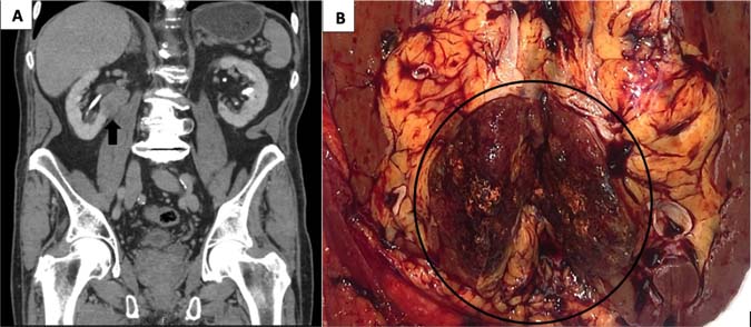 Figure 1: The Computerized Tomography (A) and the gross photograph (B) of the renal mass showing a well circumscribed tan brown mass in the right kidney extending into the renal hilum.