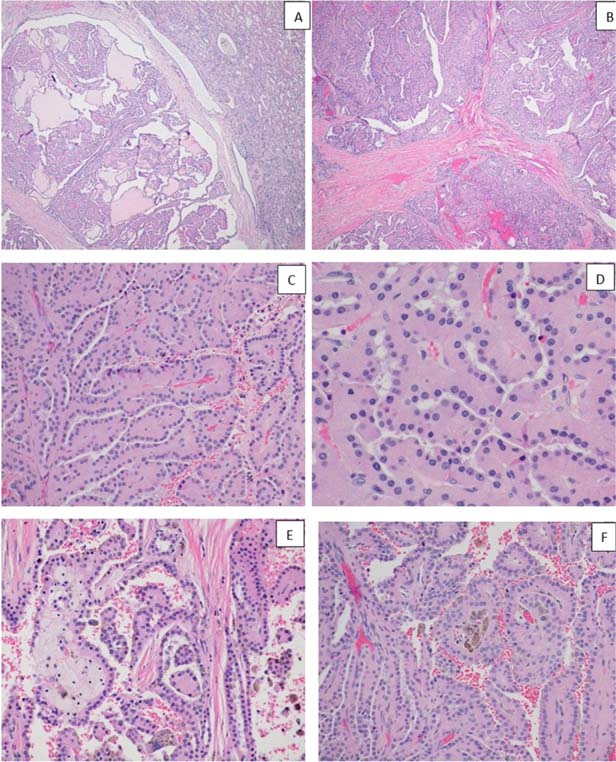 Figure 3: Hematoxylin- and eosin-stained sections of the renal tumor (A). Low magnification showing a well-circumscribed tumor with papillary structures and normal kidney on the right (×40) (B). Well-circumscribed papillary tumor with fibrous septa separating the tumor (×40) (C). Papillary architecture of the tumor with thin fibrovascular core (×100) (D). The tumor cells have abundant granular eosinophilic cytoplasm and a round nucleus placed away from the basal lamina (×400) (E). Papillary tumor with foamy histiocytes (×200) and F. Papillary tumor with hemosiderin pigment (×200) (F).