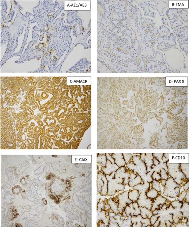 Figure 4: Immunohistochemical stains showing (A) Focal staining for AE1/AE3. (B) Membranous staining for epithelial membrane antigen (EMA). (C) Diffuse cytoplasmic staining for AMACR. (D) Diffuse nuclear staining for PAX8. (E) Focal staining for CAIX. (F) Diffuse strong luminal membranous staining for CD10.