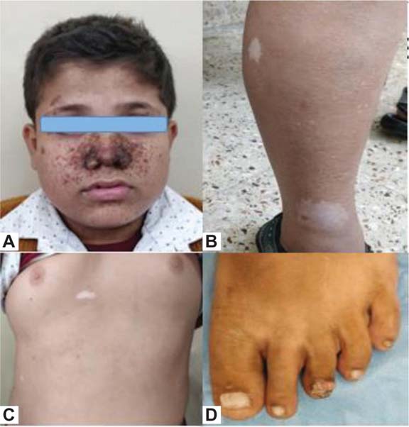 Figure 1: External clinical manifestations of tuberous sclerosis in the patient. (A) Facial angiofibromas in a classic butterfly pattern, adenoma sebaceum. Also seen is a typical forehead fibrous plaque, often seen as an early sign of tuberous sclerosis. (B) Multiple hypomelanic macules on the right lower limb, also known as ash leaf spots, caused due to lack of melanin. (C) Similar hypomelanic macule on the anterior chest wall. (D) Ungual fibroma/Koenen’s tumor present on the left 3rd toe.