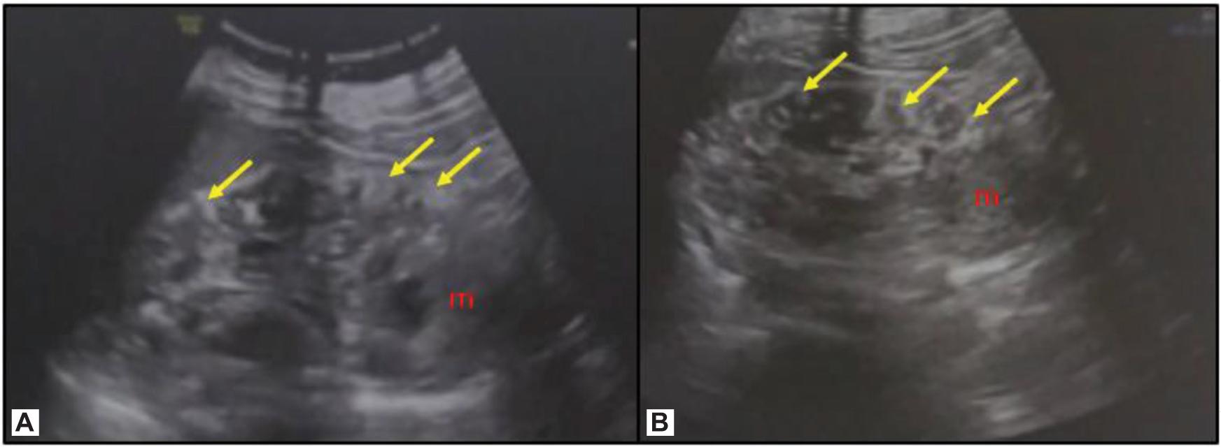 Figure 2: (A, B) Ultrasound images of the left kidney reveal multiple elongated echogenic focal lesions close to the cortex, suggesting angiomyolipomas. Note the mass from the lower pole (m).