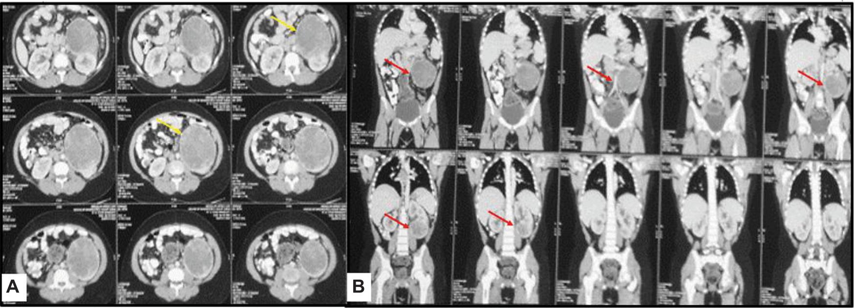 Figure 3: Images of (A) axial and (B) coronal CECT of the abdomen reveal exophytic heterogeneously enhancing solid mass (arrow) arising from the left kidney. The mass has no fat component in it.