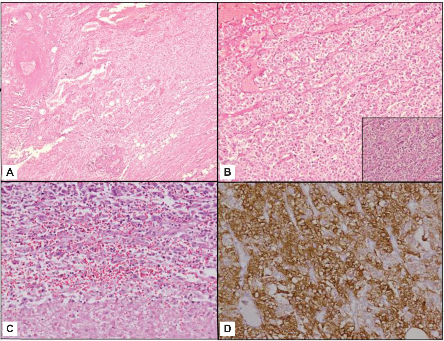 Figure 4: Histopathological findings of epithelioid angiomyolipoma. (A) Section from the mass shows a tumor predominantly composed of polygonal cells with focally present thick vessels and interspersed fat cells (hematoxylin and eosin × 40). (B) The tumor cells are predominantly epithelioid (polygonal), arranged in a nesting pattern (hematoxylin and eosin × 100). Inset comprised a high magnification image of tumor where tumor cells show moderate to abundant and clear to granular eosinophilic cytoplasm with distinct cytoplasmic boundries (hematoxylin and eosin × 200). (C) The tumor also shows large areas of necrosis. The surrounding tumor cells show moderate nuclear atypia and prominent nucleoli (hematoxylin and eosin × 200). (D) Tumor cells are immunopositive for HMB45 (× 200).