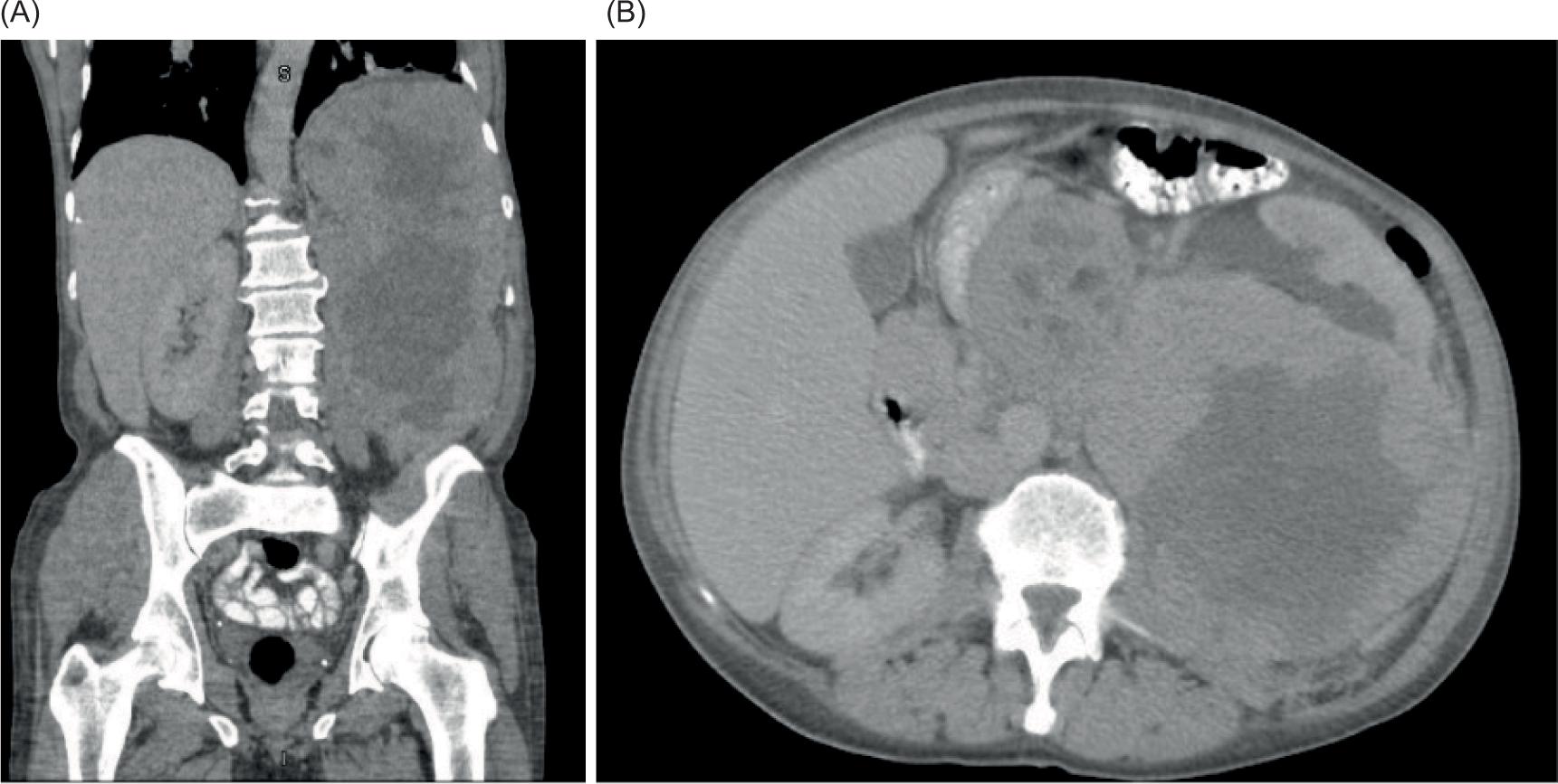 Figure 1: Abdominal CT images with contrast. CT images of the abdomen in coronal (A) and axial (B) planes with contrast enhancement demonstrating a large left retroperitoneal mass.