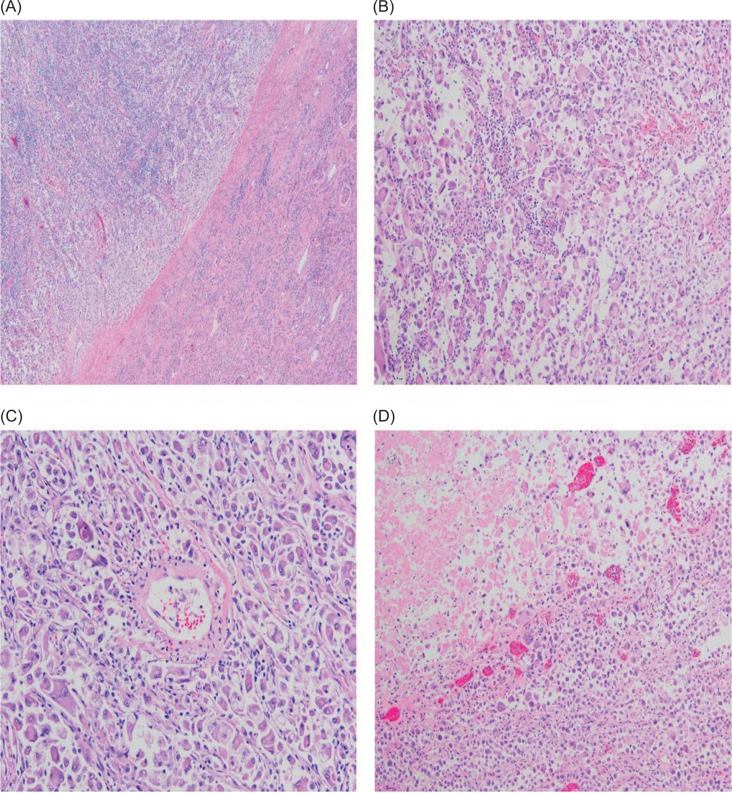 Figure 2: Primary tumor histology. Under low magnification (×40), the lesion can be seen arising in the kidney (A). Under higher magnification (×100), the lesion is composed of pleomorphic eosinophilic cells with prominent nucleoli (B), with some tumor cells intimately associated with vessels (C), and extensive necrosis (D).