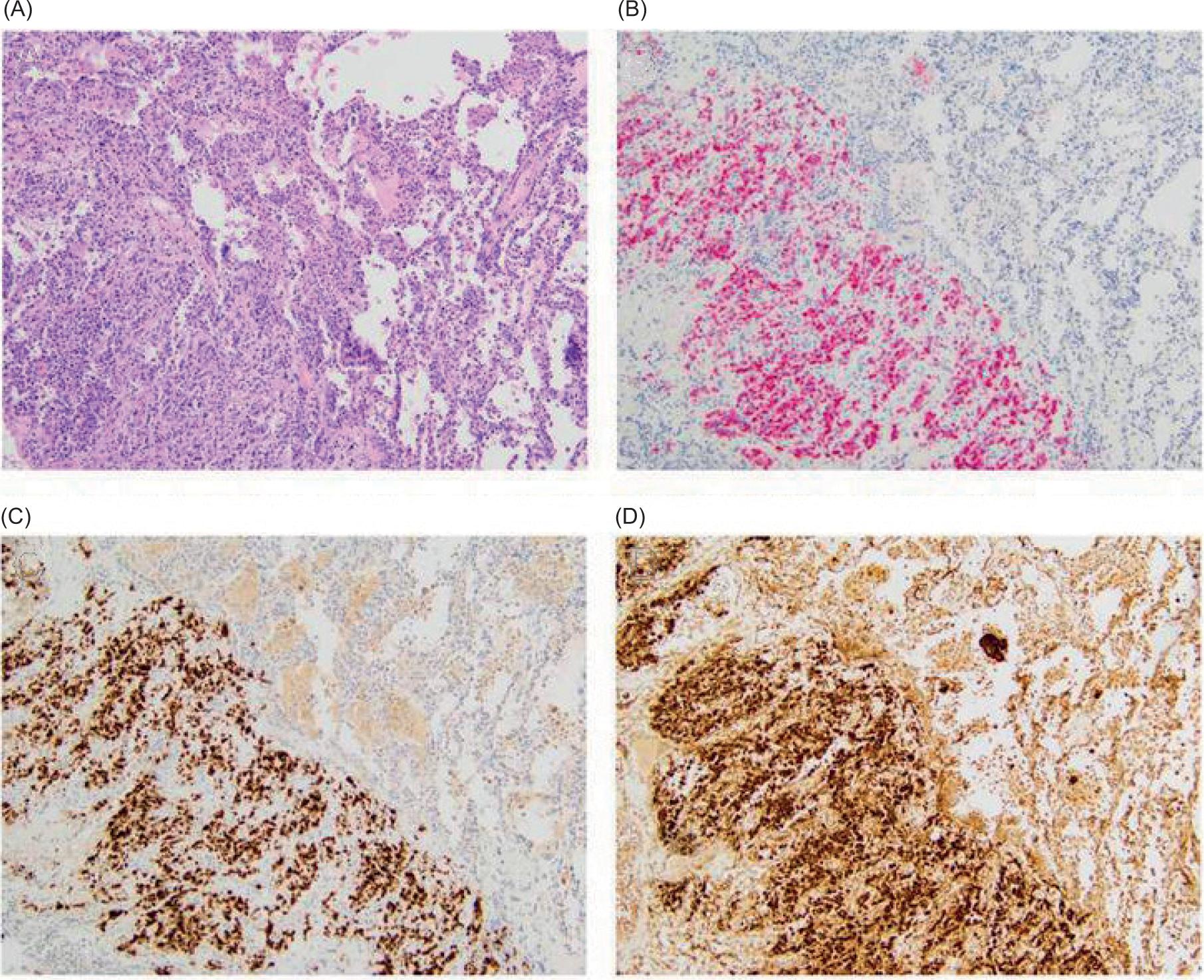 Two months postoperatively, a chest CT revealed new pulmonary nodules as well as the growth of his dominant lung nodule. The patient underwent video-assisted thoracoscopic surgery (VATS) with wedge resection of nodules in the right upper and lower lobes for the purpose of pathologic diagnosis of these lung nodules. Final pathology demonstrated metastatic EAML, measuring 2.7 cm in the right lower lobe and 1.1 cm in the right upper lobe. Surgical margins were negative. On immunohistochemistry, both the primary lesion and the metastatic foci were positive for MART1, HMB45, and Cathepsin K, patchy positive for SMA, and negative for Pankeratin, PAX8, S100, and Inhibin (Figure 3).
