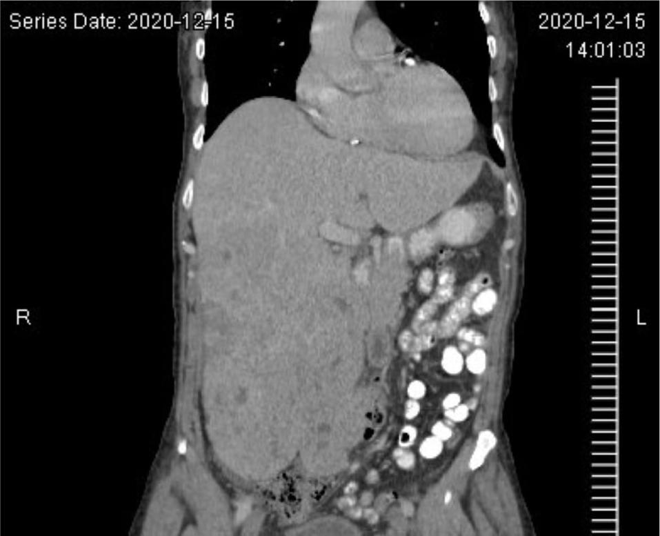 At 4 months follow-up from the VATS, a restaging CT scan demonstrated an enlarged liver with numerous low-density masses within the liver, including a conglomerate of masses within the right lobe of the liver, and an increase in the size and number of pulmonary nodules (Figure 4). The restaging CT also demonstrated the development of ascites in the pelvis and a probable tumor implant in the left peritoneal cavity, lateral to the psoas muscle. The patient was started on systemic temsirolimus, an mTOR inhibitor. Initially, after 3 months on temsirolimus, the patient demonstrated a dramatic improvement both clinically and radiographically. However, he ultimately stopped responding to temsirolimus. He was then transitioned to gemcitabine but unfortunately, the patient eventually passed away after this treatment alteration.