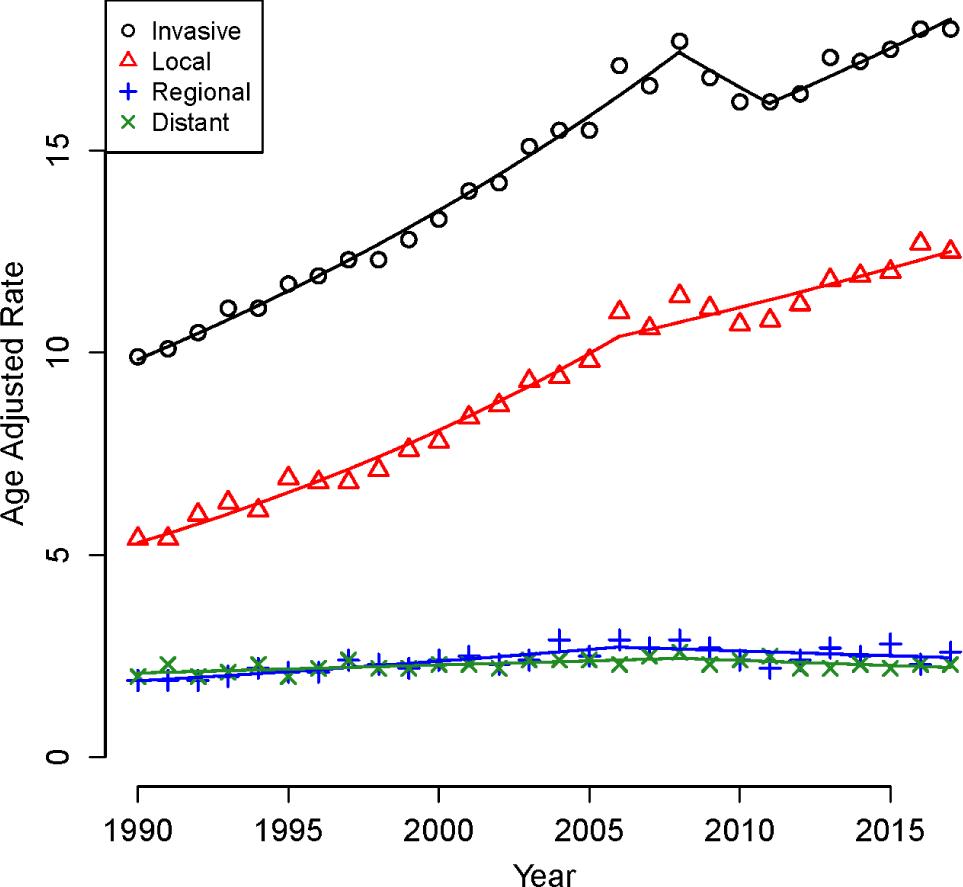 The JoinPoint Trend Analysis software (13) was then used to model annual percent changes (APCs) in age-adjusted rates (AAR). This software examines trends of gender, race, and stage through a linear approach that fits incidence rates for multiple years while standardizing incidence rates with the standard population. Maps plotting county-level incidence rates of total and distant disease across the state in 5-year time intervals were created using R software.