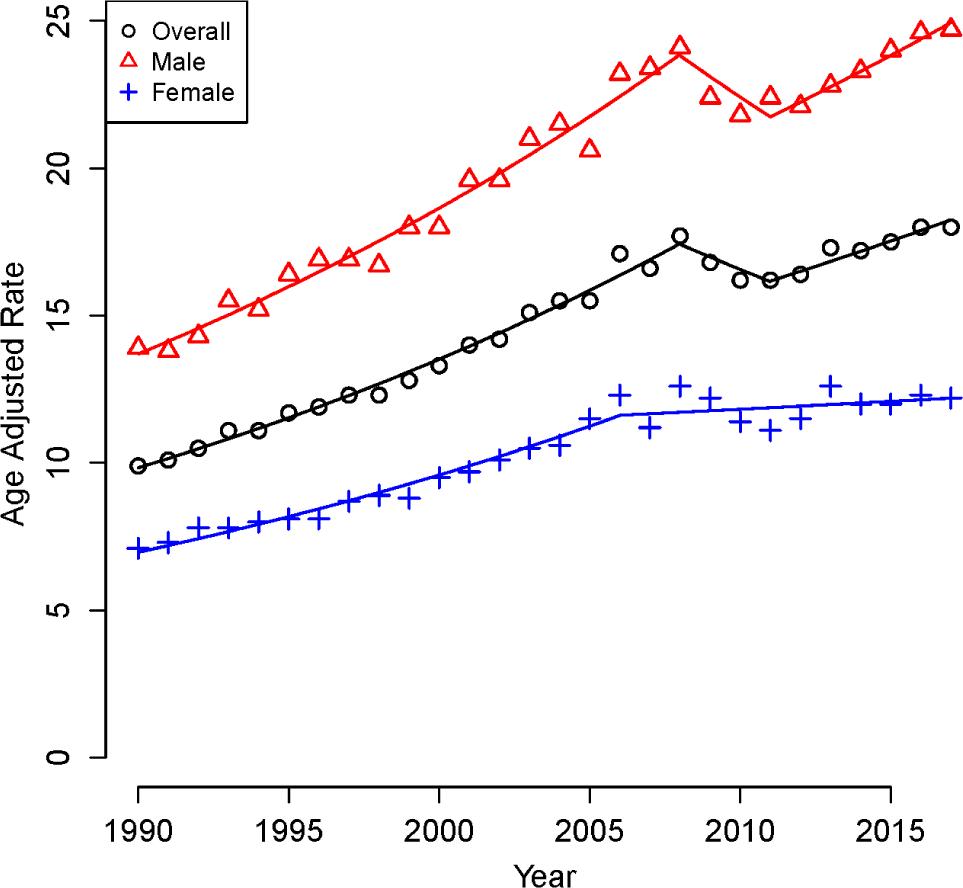 Figure 2: Gender-stratified, age-adjusted rates of RCC per 100,000 population, 1990–2017.