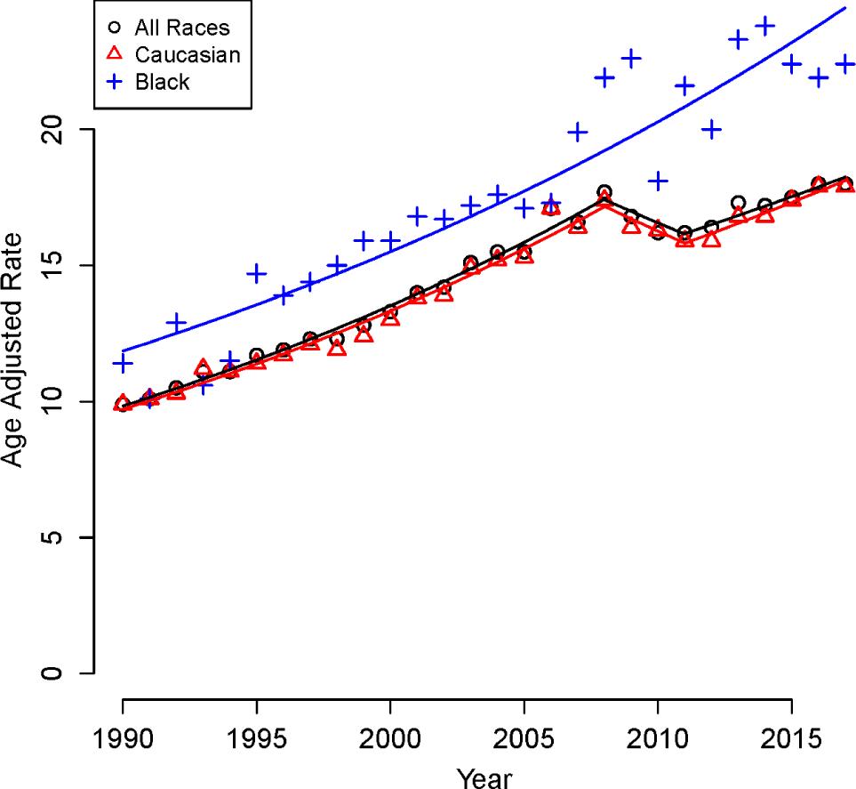 Figure 3: Race-stratified, age-adjusted rates of RCC per 100,000 population, 1990–2017.