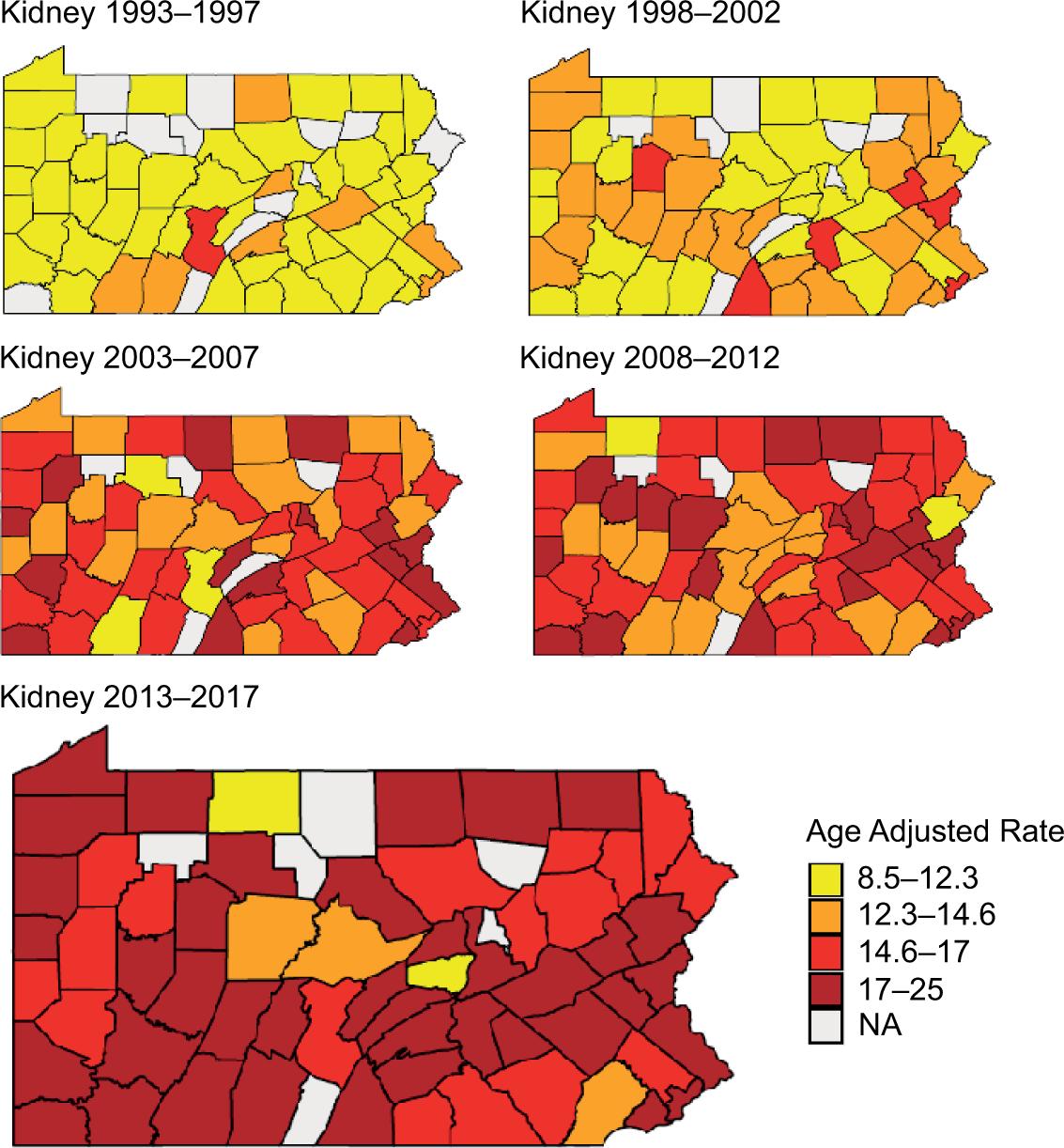Incidence of RCC has increased over the past three decades in Pennsylvania. These increases are predominantly driven by a greater diagnosis of localized disease, although one-third of the cases are regional or metastatic at presentation. Higher rates of increase were more pronounced in the younger, male population. Geospatial investigation implicates growing “hot spots” of RCC in certain parts of the state.