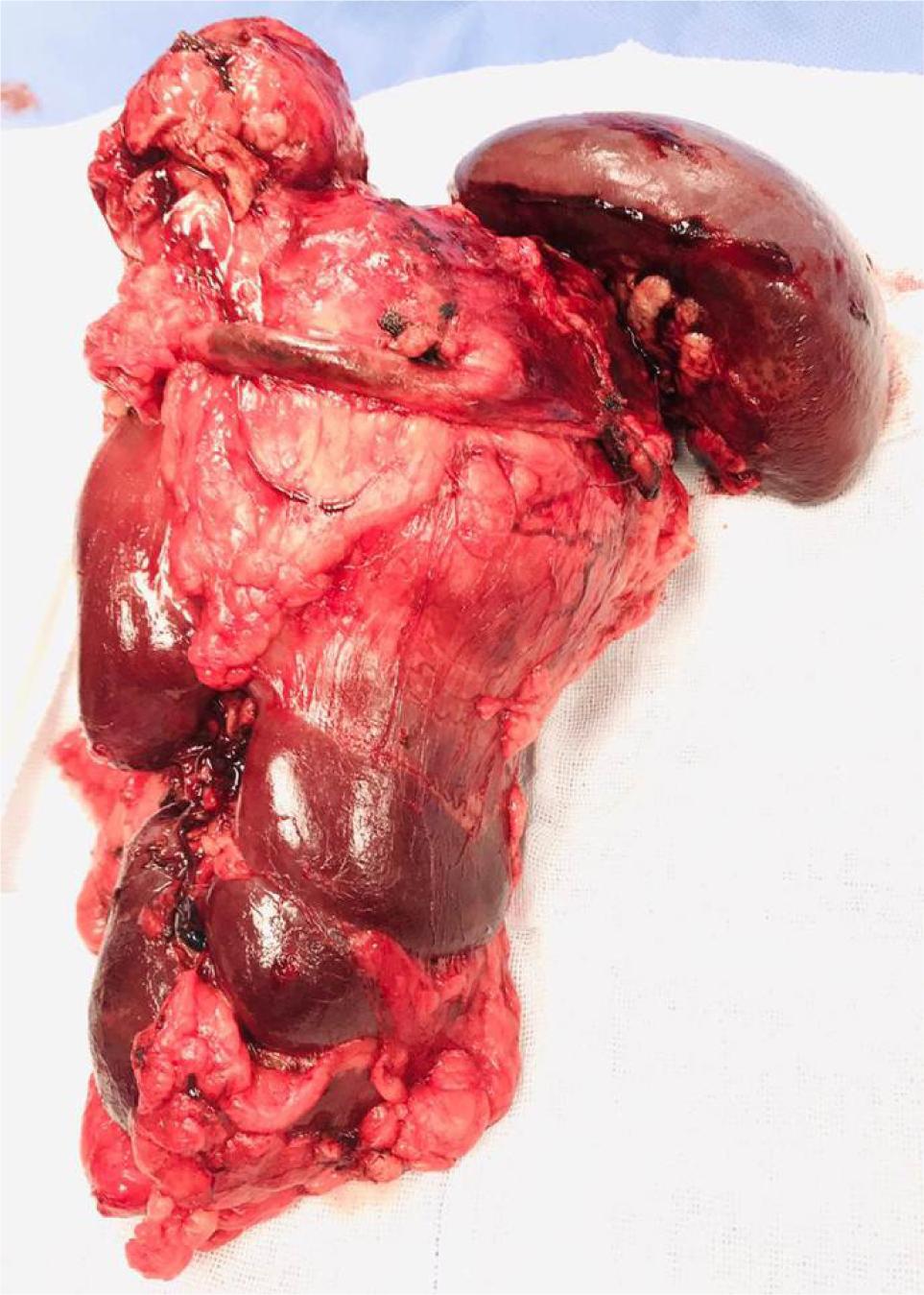 Figure 2: The resected en bloc mass showing the kidney, spleen, and tail of pancreas.