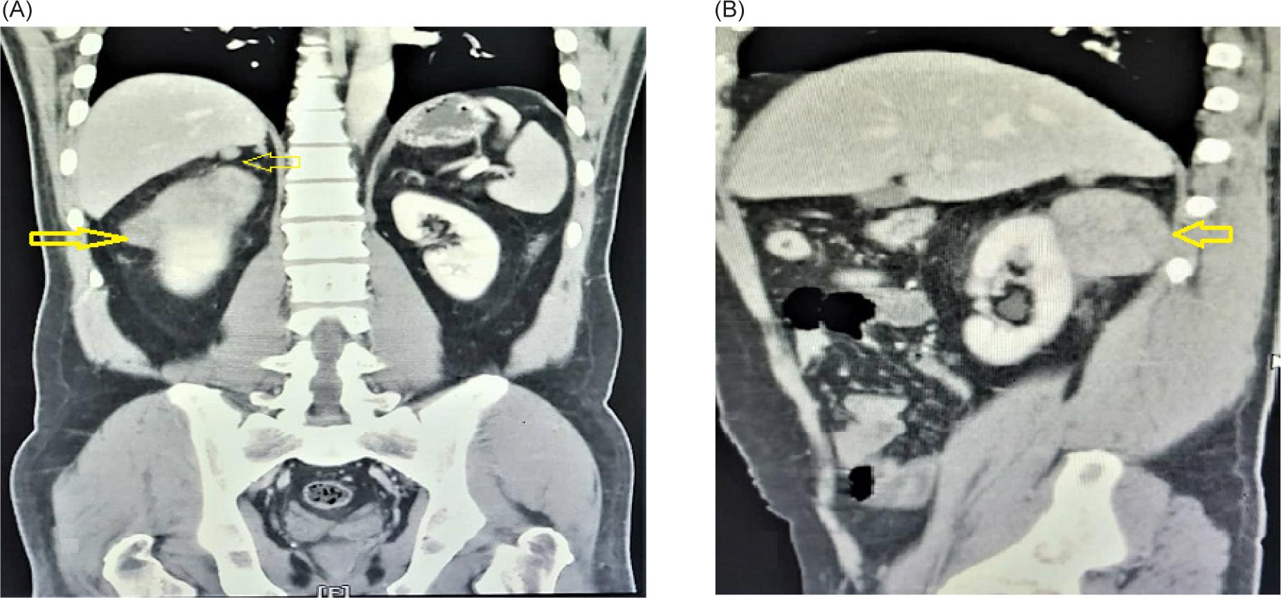 FIGURE 1: A computerized tomography (CT) scan showed: (A) Mass in the right kidney (arrow), two masses were attached to the liver tightly (arrow). (B) Oblique view of mass in the right kidney with low enhancement (arrow).