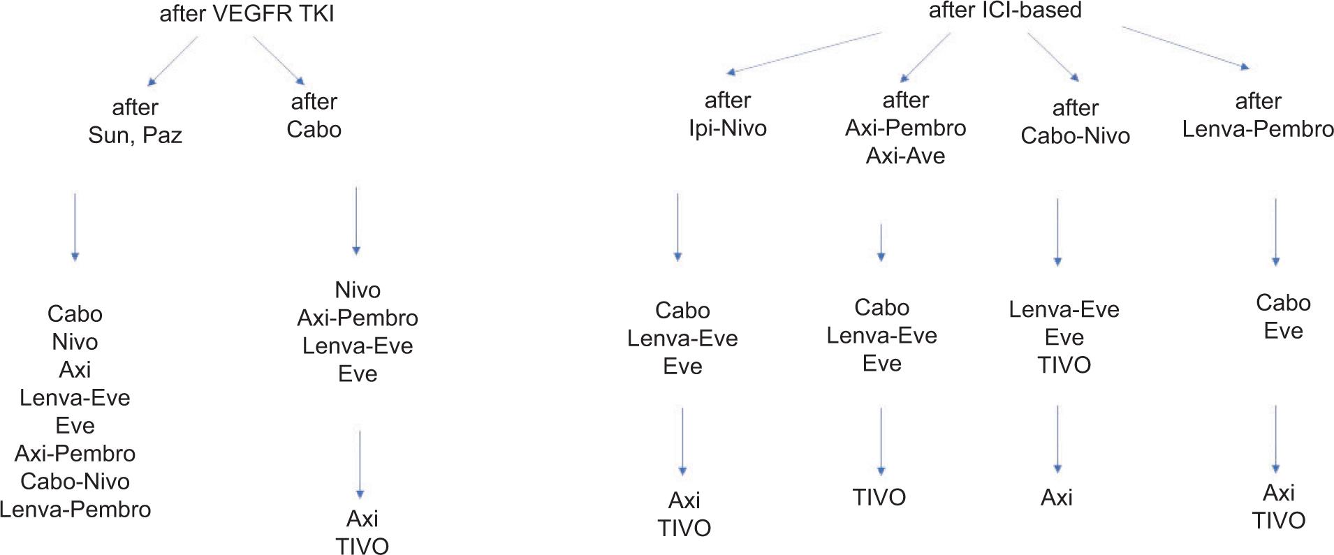 Abbreviations: RCC, renal cell carcinoma; VEGFR, vascular endothelial growth factor receptor; TKI: tyrosine kinase inhibitor; ICI, immune checkpoint inhibitor; Sun: sunitinib; Paz: pazopanib; Cabo, cabozantinib; Nivo, nivolumab; Ipi: ipilimumab; Pembro, pembrolizumab; Axi, axitinib; Tivo, tivozanib; Lenva, Lenvatinib; Eve, everolimus.