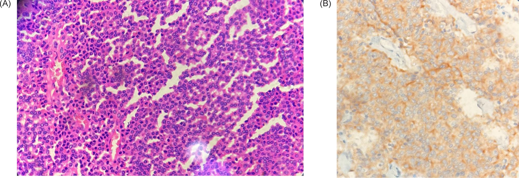Figure 3: (A) Haematoxylin and Eosin staining; (B) Synaptophysin Positivity on Immunohistochemistry.