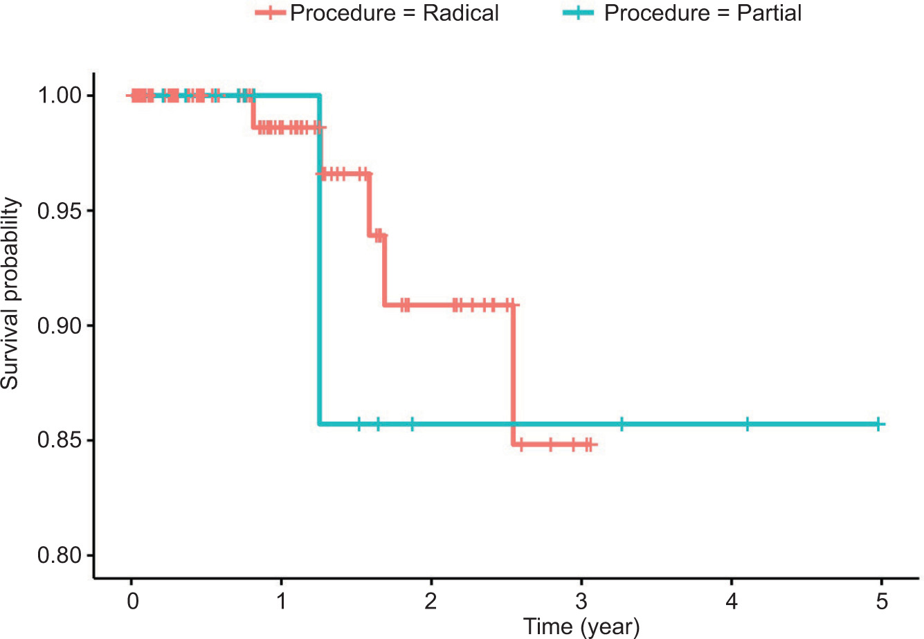 The overall local recurrence rate was 5.7%, and the metastatic progression rate was 14.9%. However, there were no significant differences in the rates of local recurrence (P = 0.597), metastatic progression (P = 0.129), and chemotherapy use (P = 0.367) between nephrectomy types (Table 1). Out of the 147 patients, 8 (5.4%) died. Patients’ survival did not differ significantly based on the type of nephrectomy (log-rank P-value = 0.852, Figure 1).