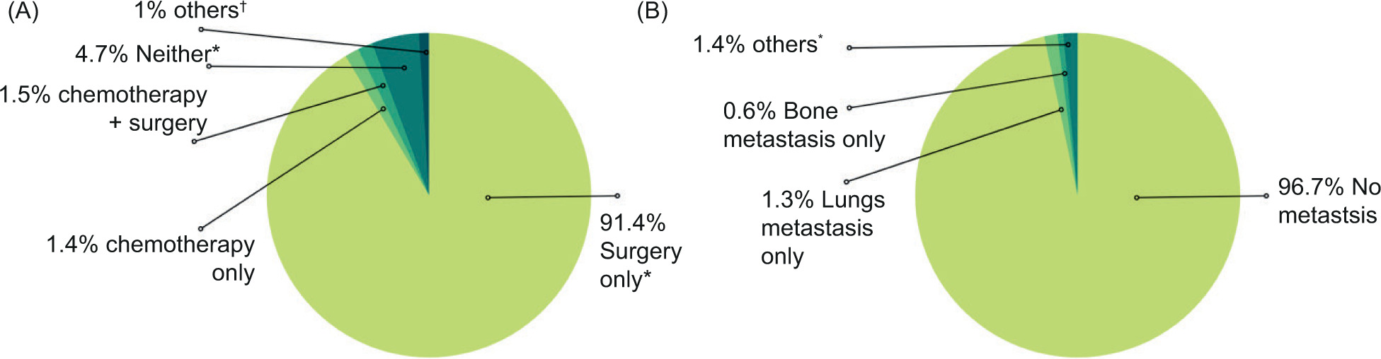 Figure 1: Papillary renal carcinoma, (A) treatment modalities, (B) metastatic pattern at the time of diagnosis.