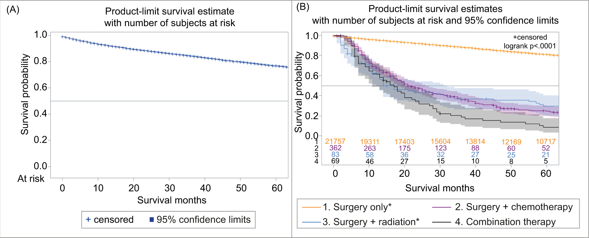 Figure 2: Papillary renal cell carcinoma, (A) overall survival, (B) survival with different treatments.