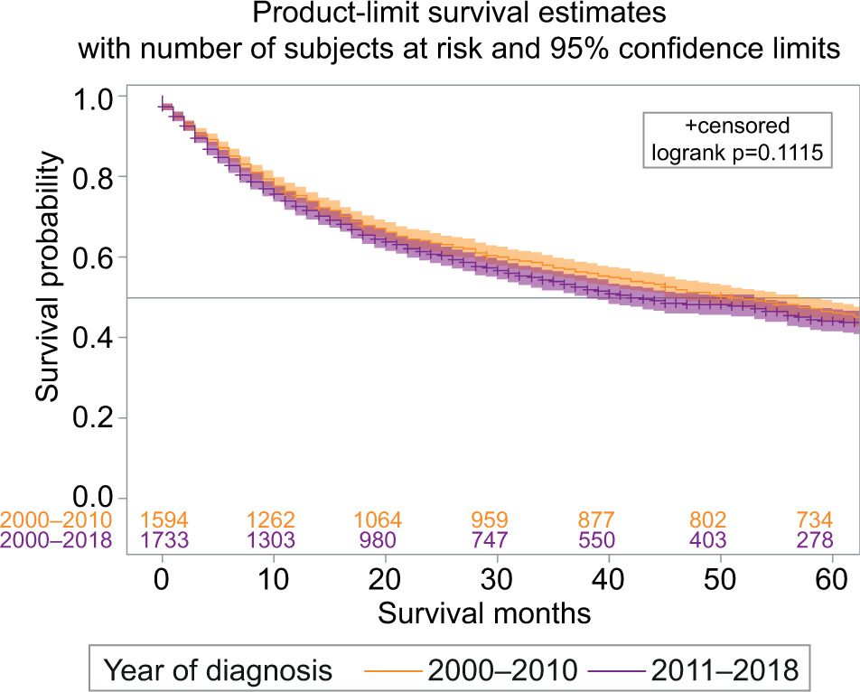 Figure 3: Regional and distant stage papillary renal cell carcinoma survival difference among those diagnosed between 2000 and 2010, and 2011 and 2018.
