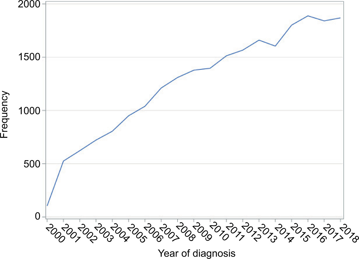 Figure 4: Papillary renal cell carcinoma annual trend from 2000 to 2018.