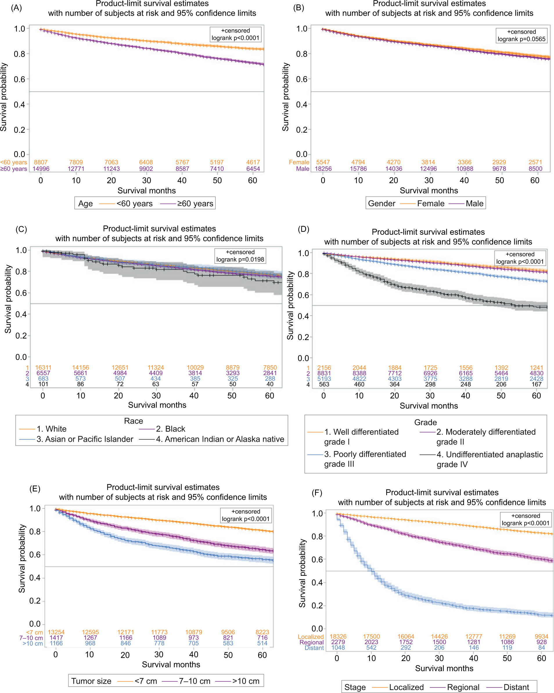 The 1-year survival for White Americans was 95.3% with a 95% CI (94.9–95.7), and at 5 years the survival was 88% (95% CI, 87.6–88.9). For Blacks, 1-year survival was 95.6% with a 95% CI (95.0–96.2), and 5 years was 88.7% (95% CI, 87.1–89.7). Survival analysis for Asians or Pacific Islanders at 1 year was 94.1% with a 95% CI (91.7–95.9), and at 5 years was 83.1% (95% CI, 79.0–86.5). The survival for American Indians or Alaska natives at 1 year was 94.8% (95% CI, 86.7–98.0) and 5-years survival was 86.7% (95% CI, 75.6–92.9). Age > 60, Grade IV, tumor size > 10, and distant disease were associated with worse clinical outcomes (P < 0.0001) (Figure 5).